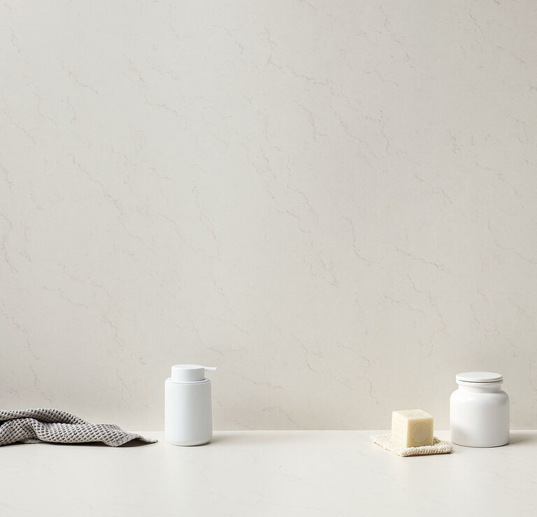 Aratea Stone redefines a classic decor, featuring a natural stone-inspired design with diagonal subtle veining and a warm, neutral tone.