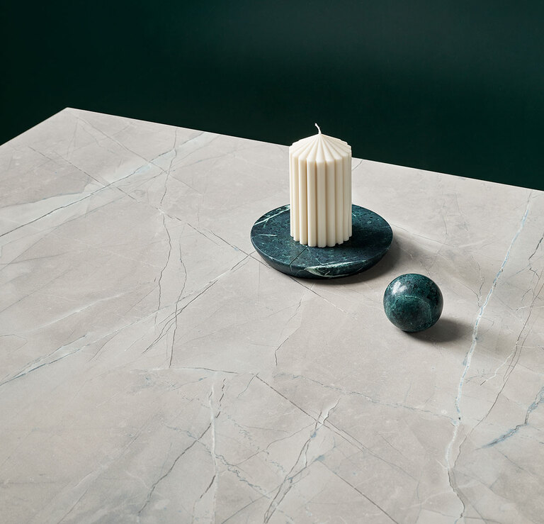 Kalahari, a granite-inspired decor, features bold veins that segment the surface and a soft blue gradient that enhances its 3-D effect.