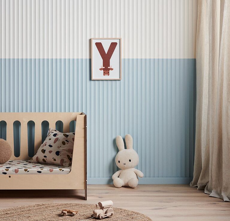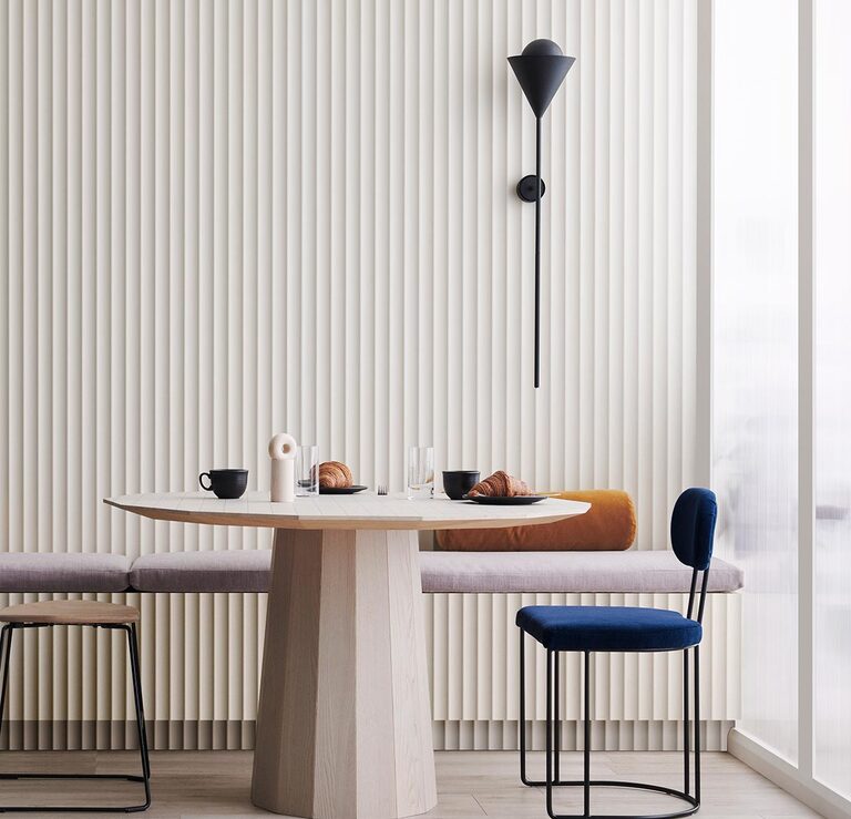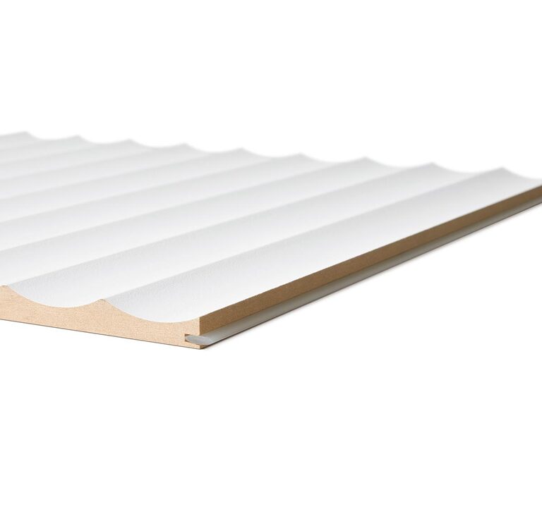 Scallop 45 is manufactured from 12mm moisture-resistant MDF. The reverse side is a flat face sealed with a white Low Pressure Melamine (LPM). It is designed for interior application and is available in two panel sizes.