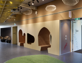 In the library, Melteca Aged Ash forms the floor-to-ceiling shelving and reading nooks, lending the book displays a sense of scale to match the soaring, open space. At the base of the units, soft-fabric reading nooks – referencing Taranaki’s coastal sands – introduce an elegant contrast, anchoring the warm timber tones and reinforcing the layered material palette woven throughout the building.