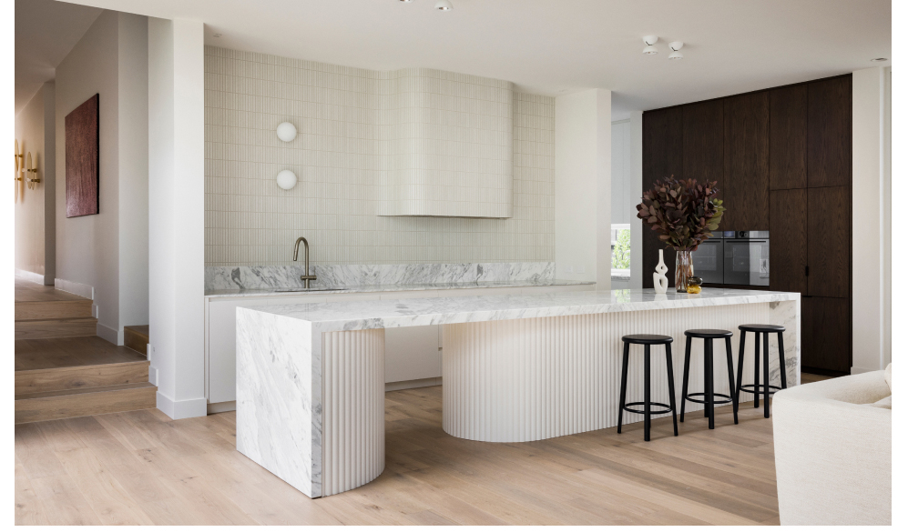 Surround by Laminex can be curved and fixed to curved surfaces. The process involves creating a series of saw cuts (called kerf cutting) in the back of the panel. It is recommended that a qualified tradesperson undertakes this work. For more details on curving, see the Installation Manual.