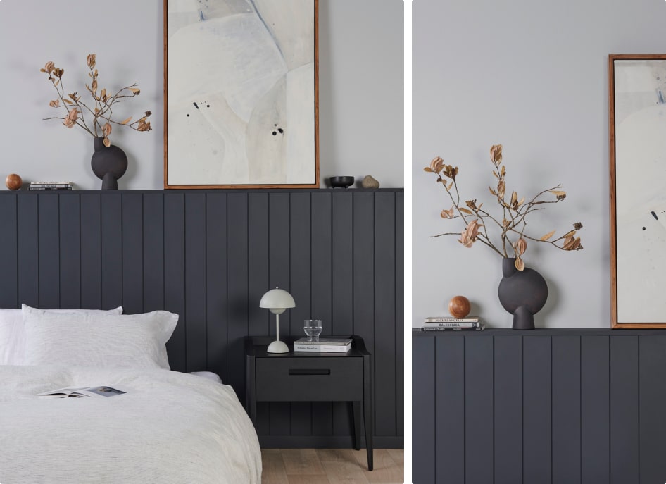 “I chose the Classic VJ 100 profile - a timeless tongue and groove panelling - for the bedroom to create a built-in bedhead as well as a shelf for displaying art, books, and sculptural objects. The dark charcoal colour of Dulux Rāwene adds a touch of drama.”