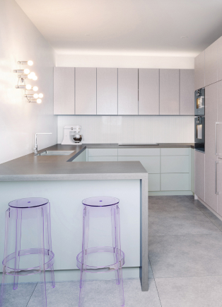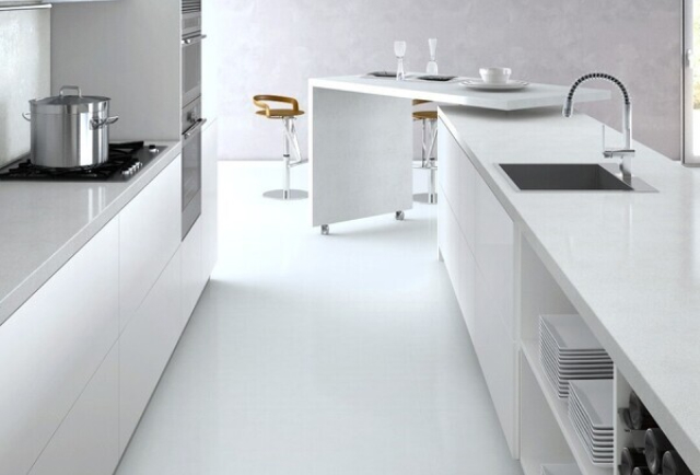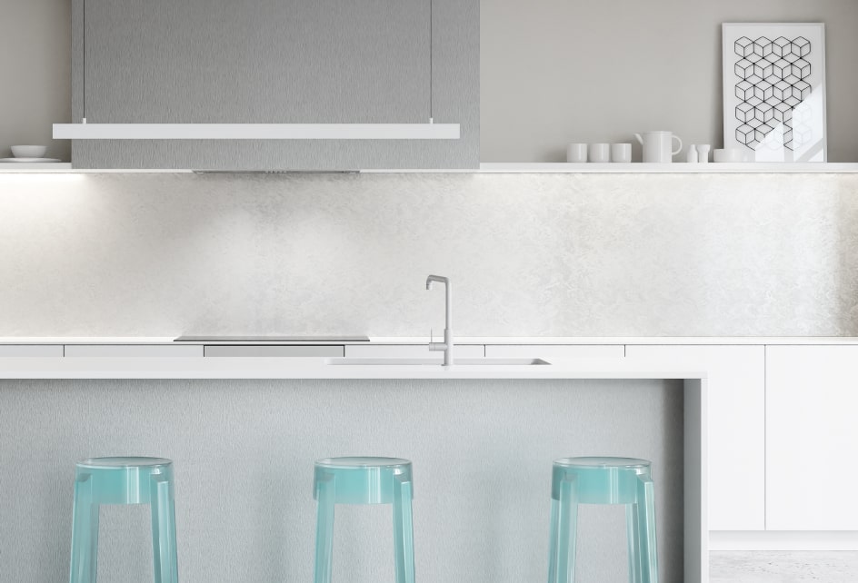 From left to right: 1. Caesarstone Ice Snow 2. HIMACS Opal 3. Laminex Laminate Graphite, Zincworks and Melteca Spinifex