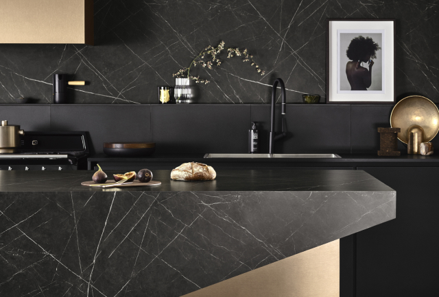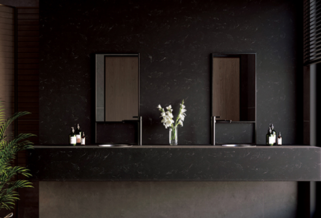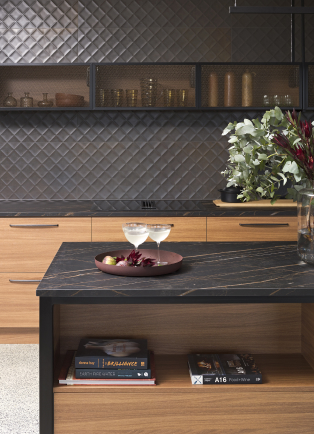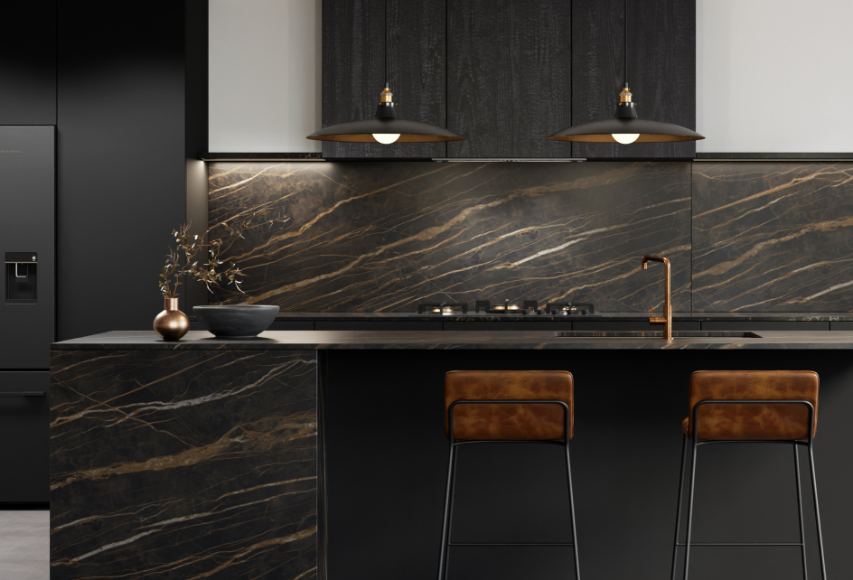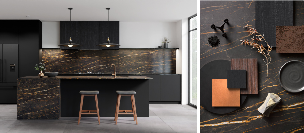 From left to right: 1. Benchtop: Laminex Formica Laminate Nero Grafite 2. Benchtop: Laminam Noir Desir, Cabinetry: Melteca Oiled Legno 4. HIMACS Aurora Sanremo 5. Cabinetry: Melteca Shou Sugi