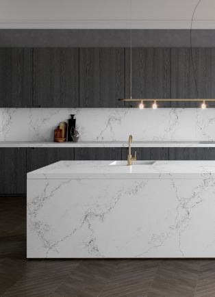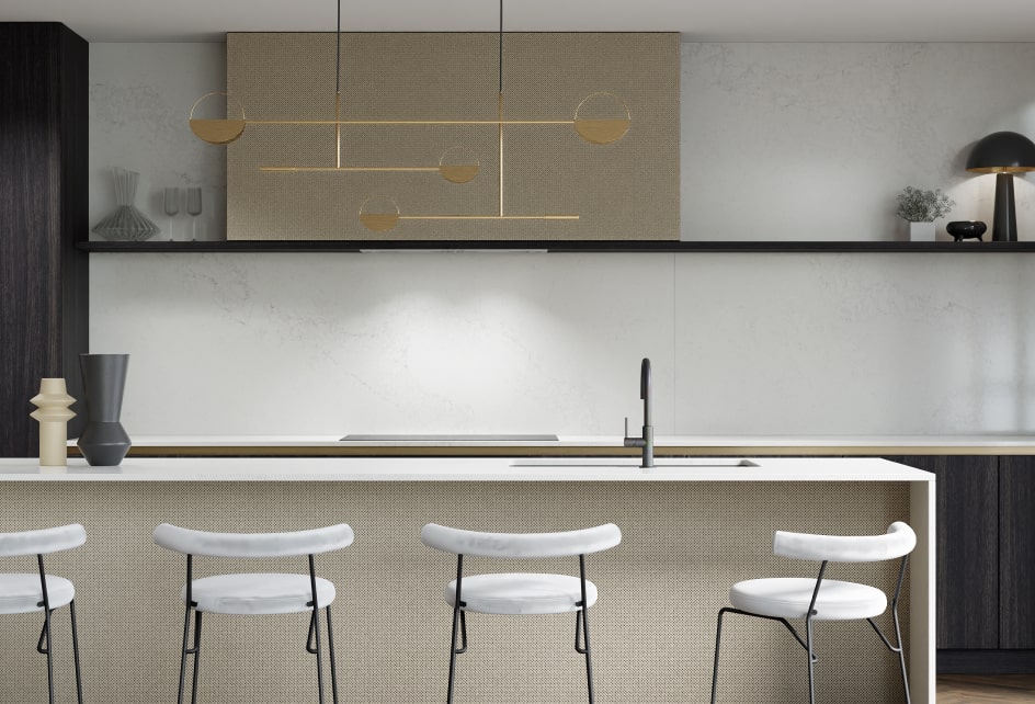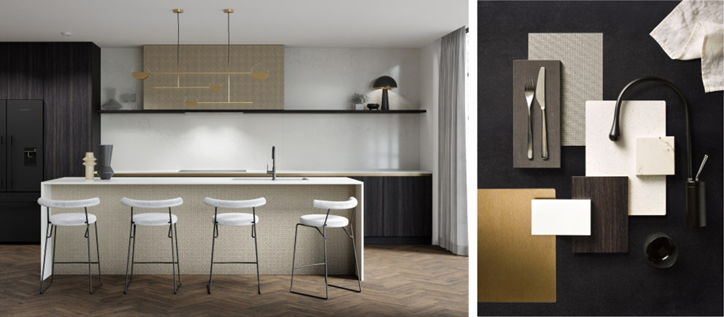 From left to right: 1. Cabinetry: Melteca Whitewashed Oak Organic, Melteca Black Organic, Benchtop: Laminam Pietra Grey 2. Benchtop and Splashback: Caesarstone Vanilla Noir Cabinetry: Melteca Planked Urban Oak, Laminex Acrylic Panel Pitch Black Credit: Creative Kitchens and Stone 3. Caesarstone Empira White Benchtop