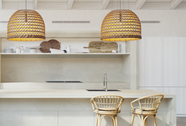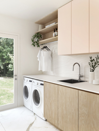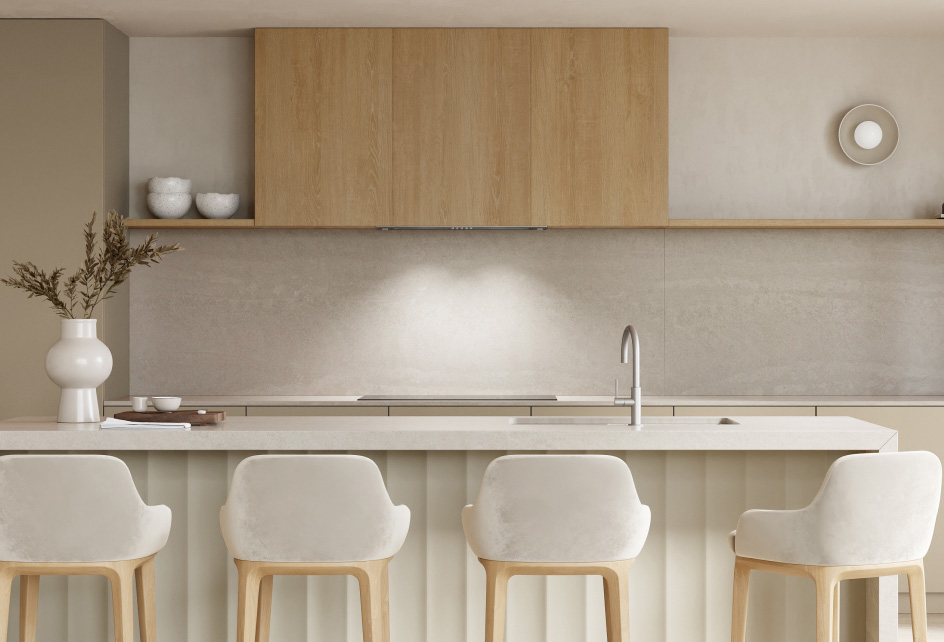 From left to right: 1. Joinery: Ryan’s Kitchens, Builder: Built Christchurch, Benchtops: Caesarstone Fresh Concrete, Cabinetry: Melteca Aged Ash 2. Cabinetry: Melteca Porcelain Blush and Raw Birchply, Splashback Laminam Aredesia Bianco a Spacco 3. Surround by Laminex Demi Round 40 4. Caesarstone Adamina Benchtop