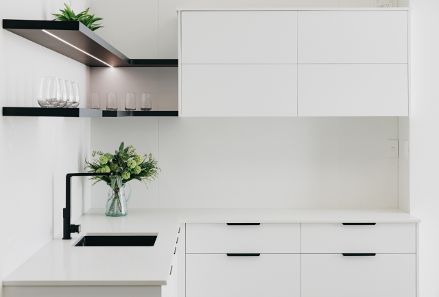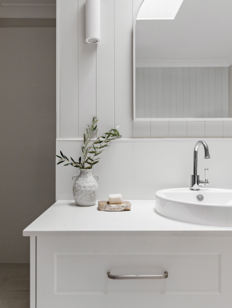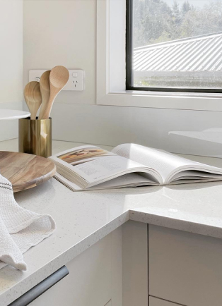 Left to right: 1. Laminex Acrylic Panel White Linen, Caesarstone Snow Benchtop, Creative Kitchens and Stone 2. Caesarstone Intense White, Oak and Orange 3. Laminex Laminate Pure Mineralstone, Steadfast Joinery 4. Caesarstone Empira White 5. Seratone Aquapanel Polar White Tile