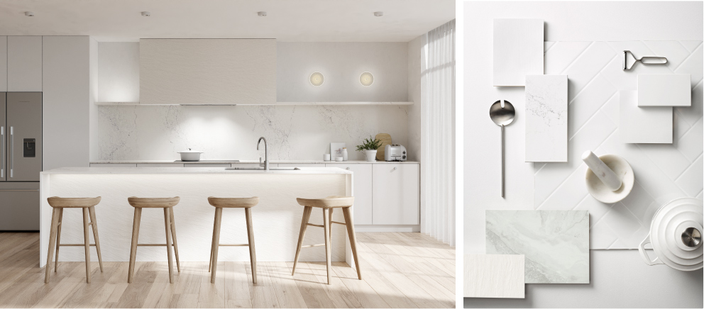 This style pairs the simplicity and cleanliness of white with subtle details and patterns in stone textures, resulting in a space that feels elegant, sophisticated and approachable all at once.