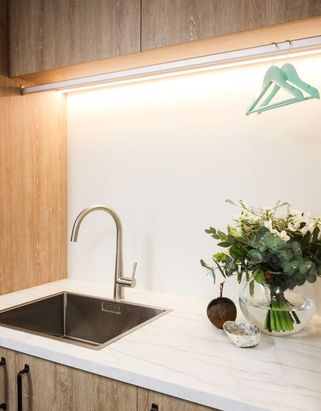 This warm and sophisticated laundry by Ryan’s Kitchens uses Laminex Formica Laminate in Cararra Delicata on the benchtop with Melteca Planked Urban Oak cabinetry