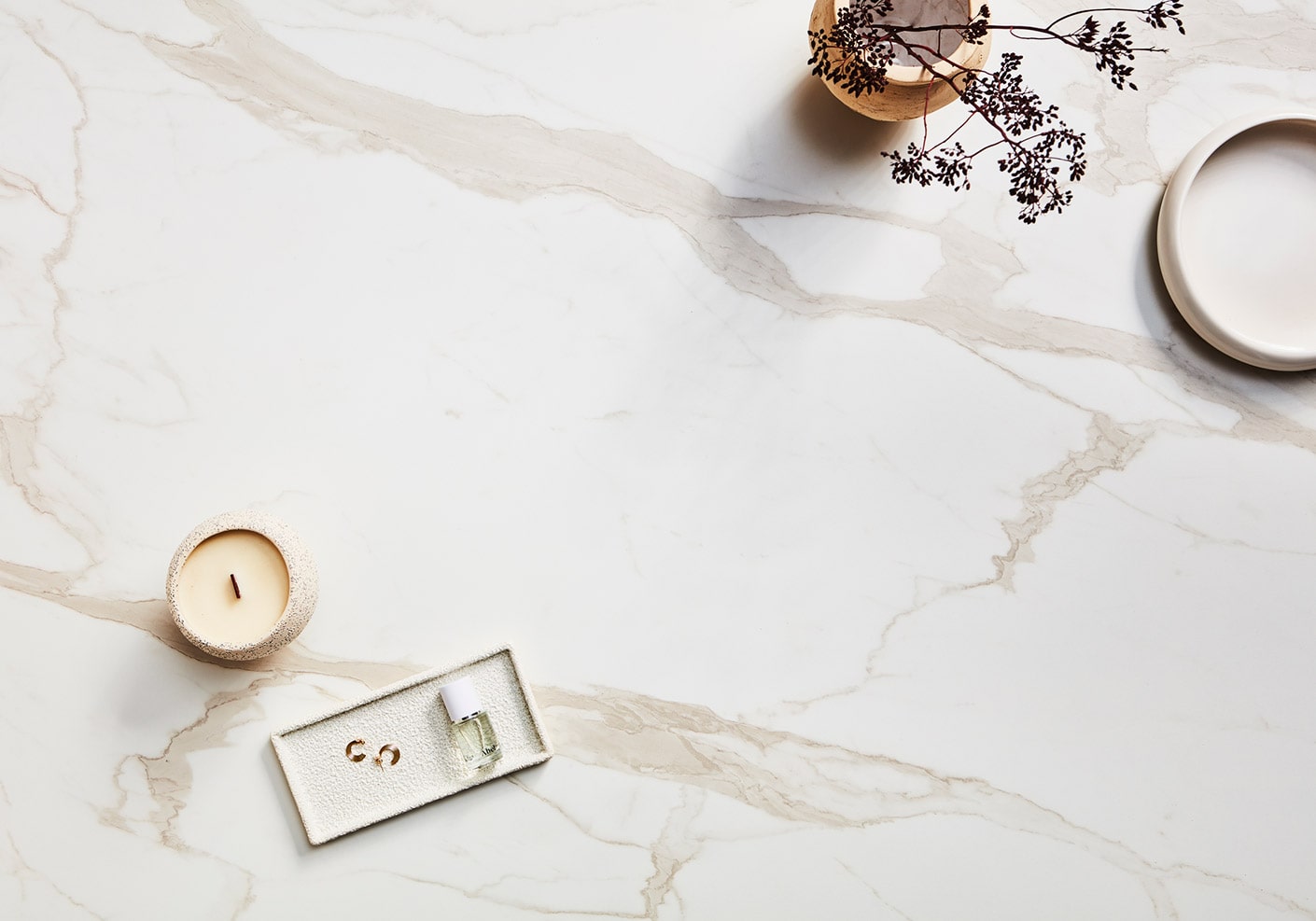 Laminex Formica Laminate Calacatta Gold is a stunning white marble with large golden cream vein
