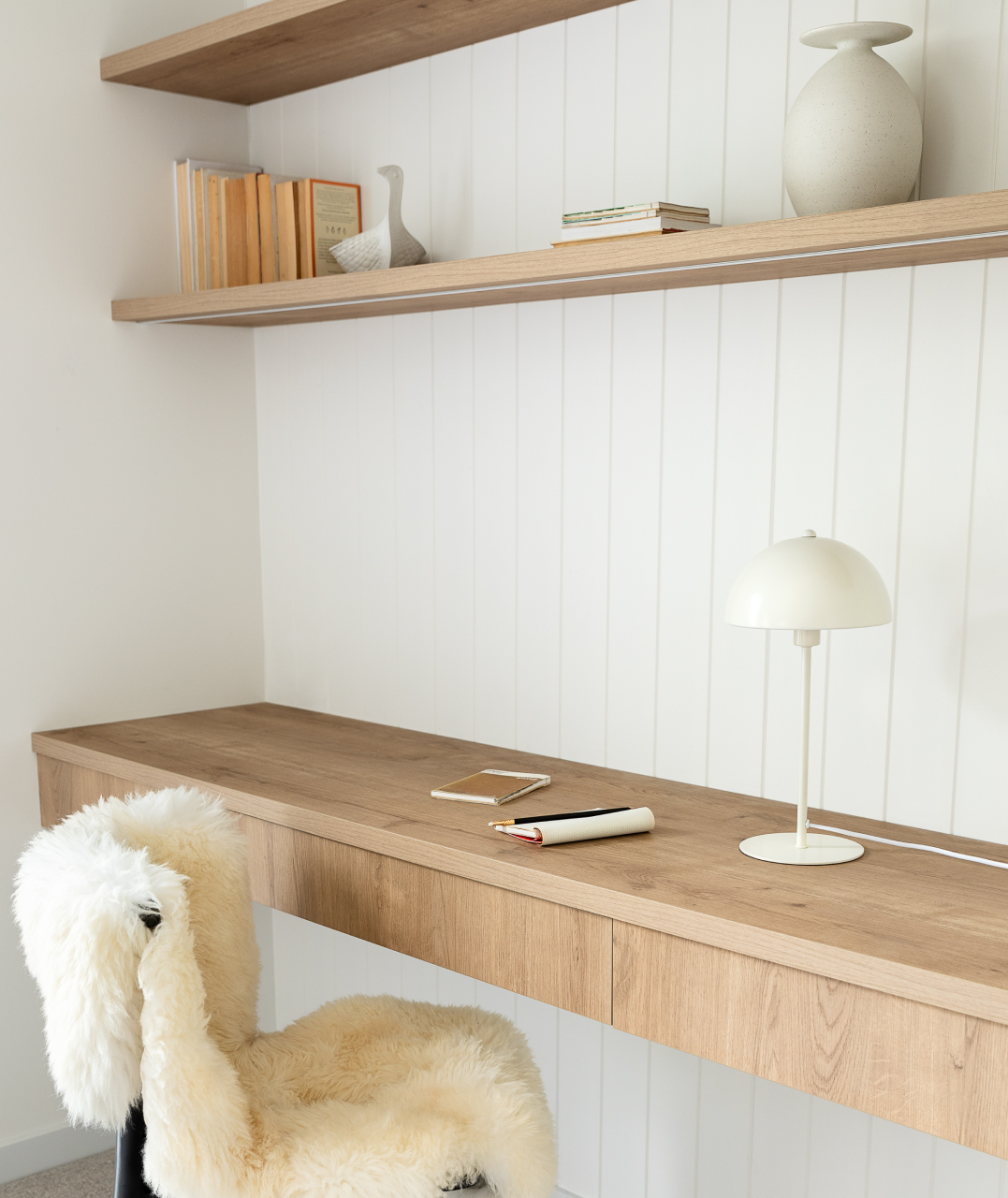 This inviting study nook uses Melteca Planked Urban Oak and Surround by Laminex Classic VJ 100 to create a calming space for focused work.