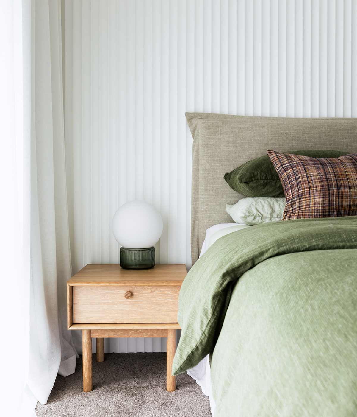 This beautiful bedroom by Twill Interiors uses Surround by Laminex Scallop 45 for a feature wall that plays on light and shadow, adding texture and a sense of playfulness to the space.