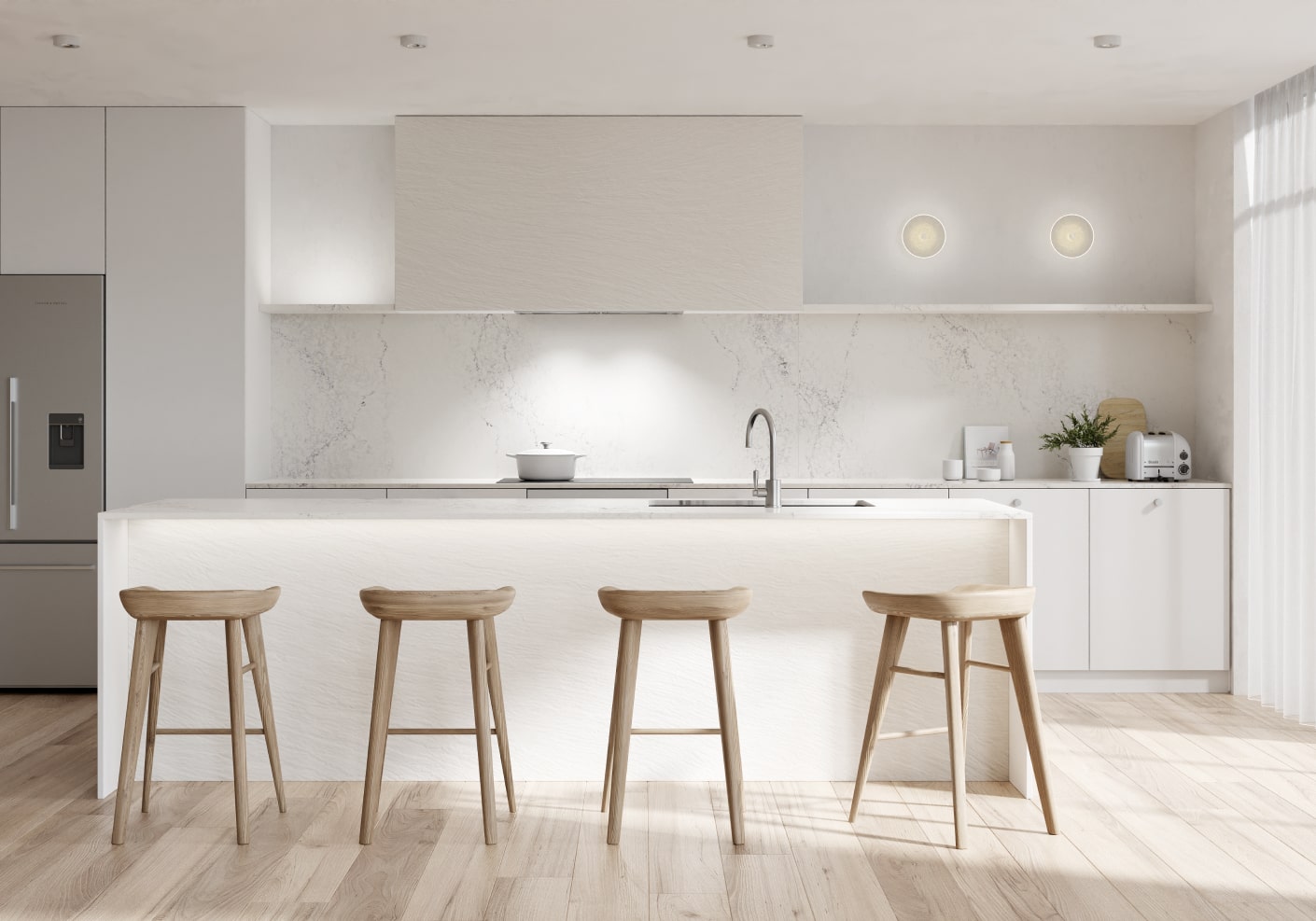 The all-white kitchen is timeless. Luminous and optimistic, white speaks of cleanliness and a readiness for entertaining. Delicate veining patterns bring subtle details to White Nights. Simple and minimal, this design style is quietly self-assured.
