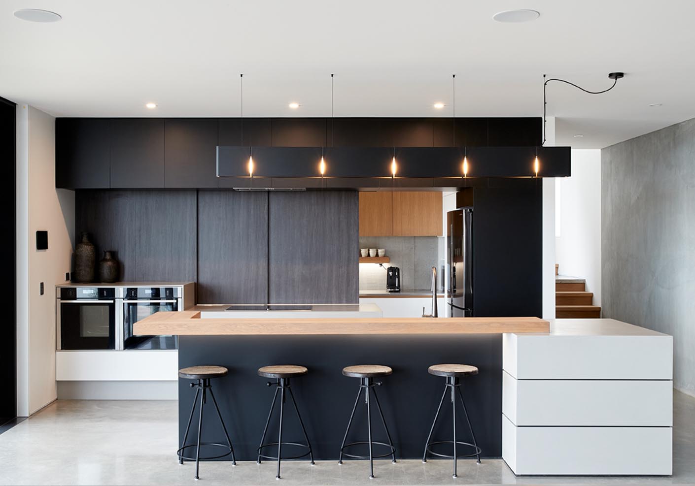 Experience the perfect balance of light and dark in this stunning award-winning kitchen designed by Mark Bruce. Featuring Laminex Acrylic Panels, this design exudes sophistication and style. The light-filled open space creates a warm and inviting atmosphere, while the negative detailing and strong use of textures and mixing materials bring a bold and rugged edge to the room.