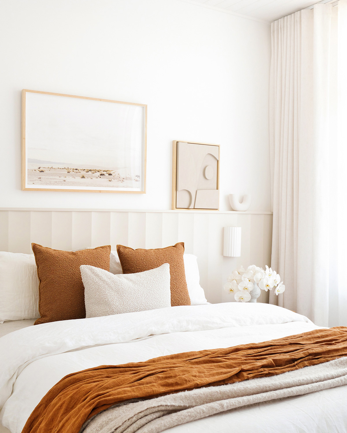 Drift away with the soft calming curves of the Surround by Laminex Scallop 135 profile on this wall to wall bedhead. Installed with a wide ledge for easy styling, we just love how all the pieces come together in this gorgeous space.