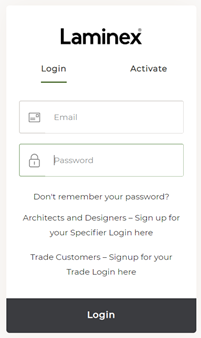 Before you place your first sample order, you will need to activate your account. Please visit store.laminex.co.nz and click on “Activate” in the upper right hand corner. Enter the email address you used when you signed up. Next, choose a password for your account and enter that into the “Password” field. Click “Activate Account”.