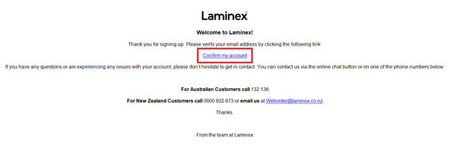 After clicking “Activate Account”, you'll receive an email asking you to verify your email address, click on the “Confirm My Account” link in this email and you're ready to log in and place your first sample order! For future orders, please go to https://laminex.co.nz and login to begin placing sample orders. This is also the best URL to use as if you wish to create a bookmark.