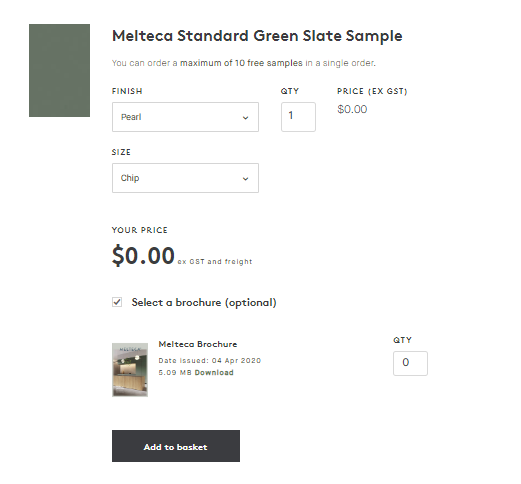 Select the finish and size or sample you are interested in. To select a brochure, click the tick box to see the available options. Enter the desired quantity and Add to basket. The requested items are added to your sample basket cart.