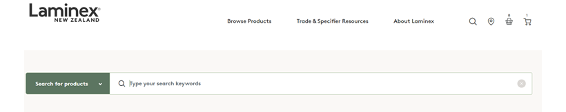 To place a sample or brochure order, find the product you are interested in using the search button in the top right of your screen this pulls up a window allowing you to filter your search via a drop-down menu if required. Search for the product you wish to find, e.g. “Melteca Bayleaf” or “Caesarstone”.