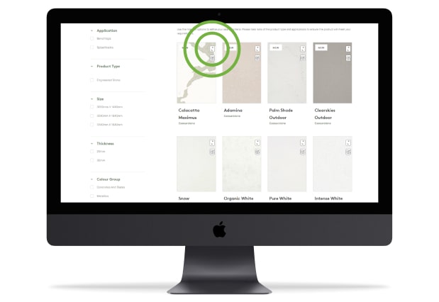 To place a sample or brochure order, find the product you are interested in using the search button in the top right of your screen this pulls up a window allowing you to filter your search via a drop-down menu if required. Search for the product you wish to find, e.g. “Melteca Bayleaf” or “Caesarstone”.