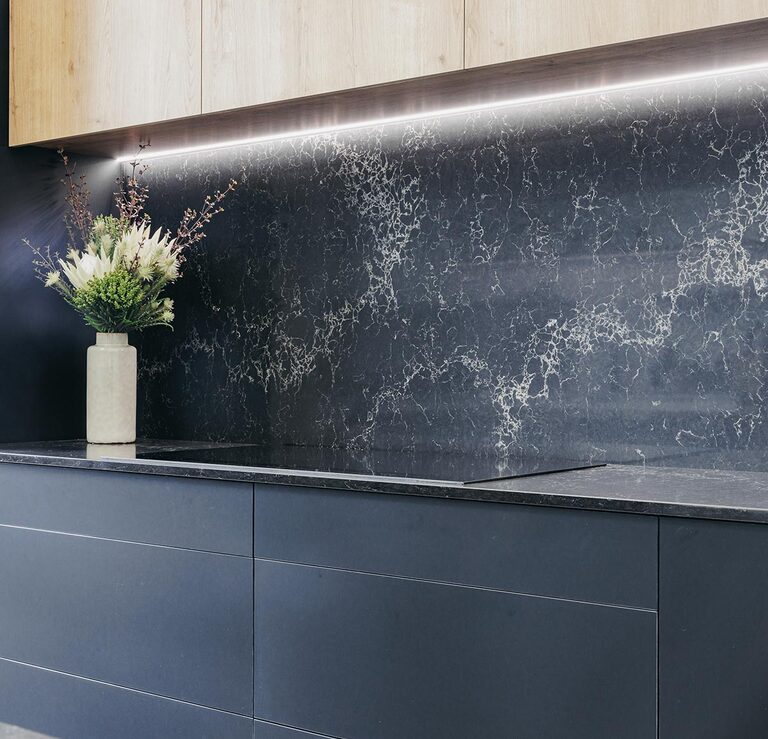 Kitchen by Creative Kitchens and Stone, Vanilla Noir Benchtop and Splashback with Acrylic Pitch Black