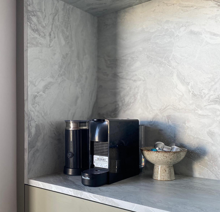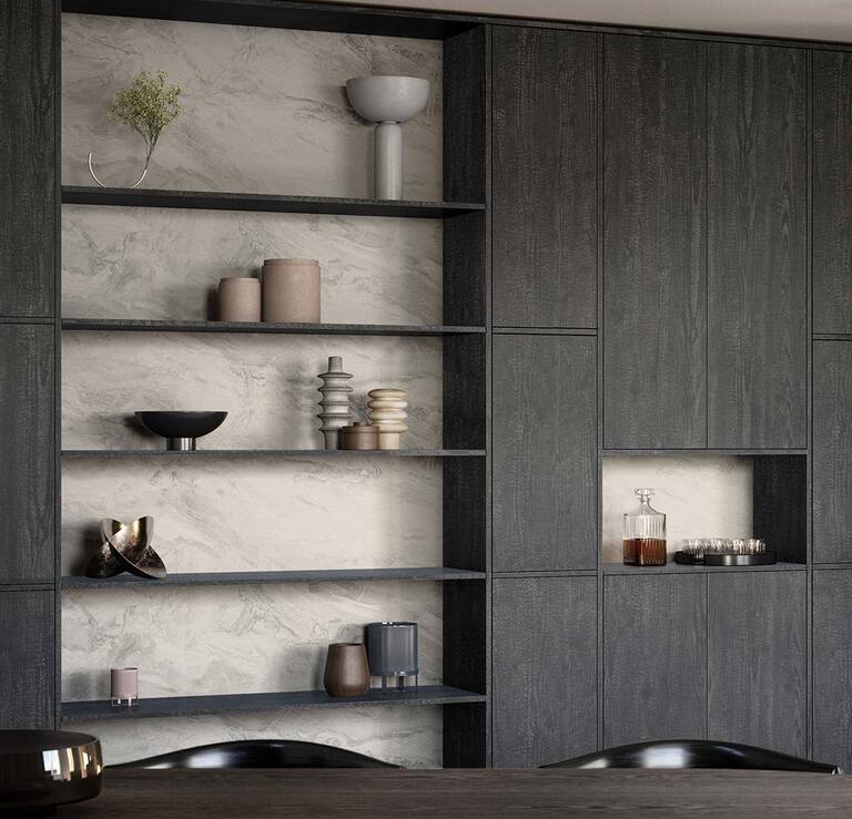 Kitchen images from Operation_homeimprovements. Bookcase image is a Melteca Shou Sugi bookcase with Pietra Cloud laminate at the back.