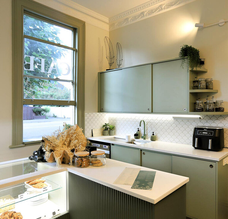 The Function Room Café image from The Custom Space features Melteca Bayleaf Naturale cabinetry