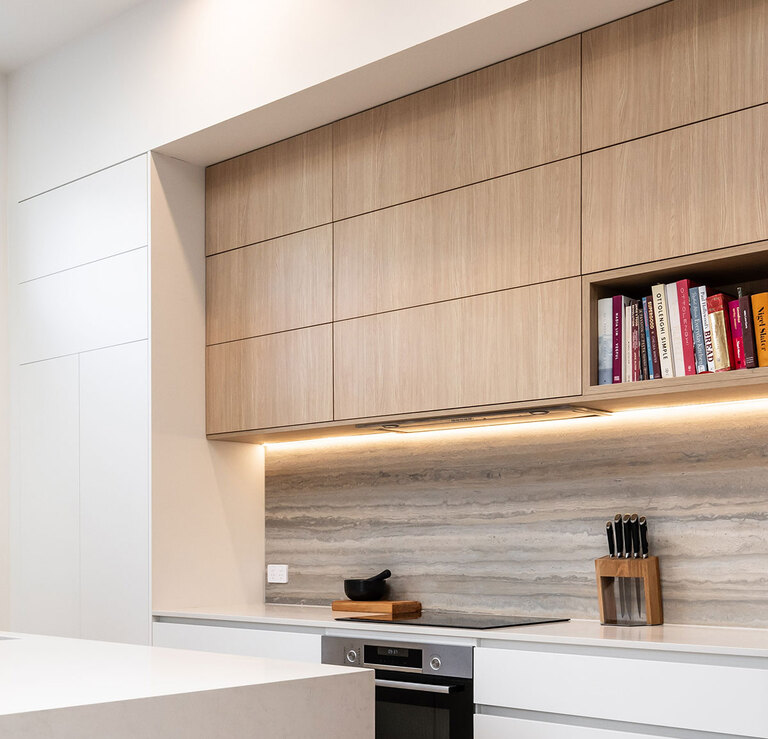 Maple and Stone have used our Laminam Travertino Grigio Venato for the splashback in this warm and inviting kitchen. Melteca Aged Ash and Laminex Acrylic Panels in Meringue on the cabinetry complement the warm tones of the splashback