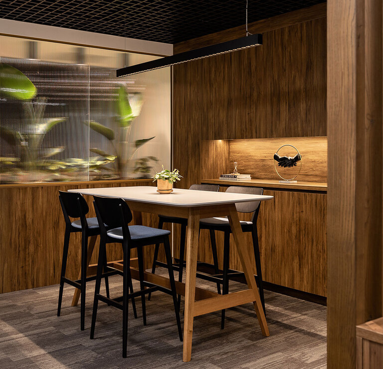 In the office image Melteca Aged Walnut panelling adds warmth and sophistication to a breakout area in the Livefirm Construction offices. Designed by Cachet Group.
